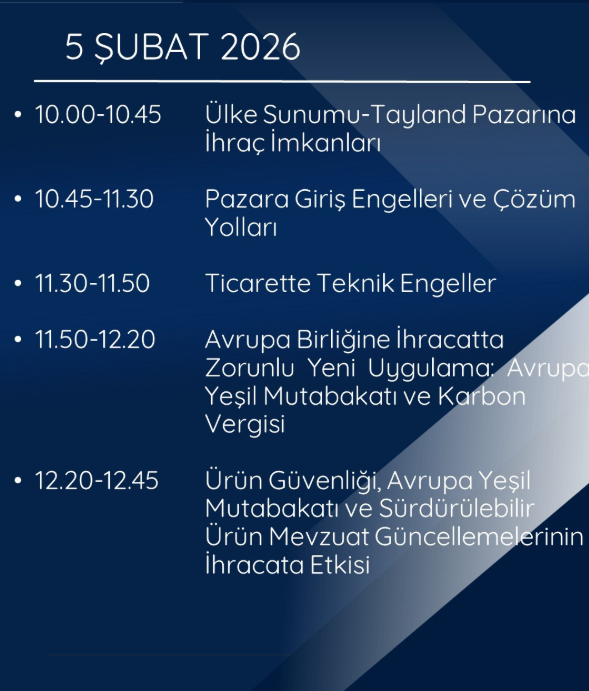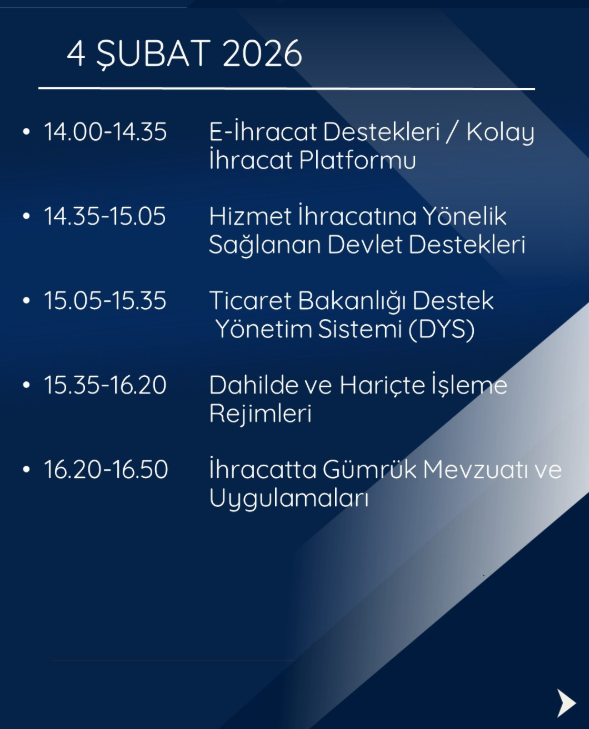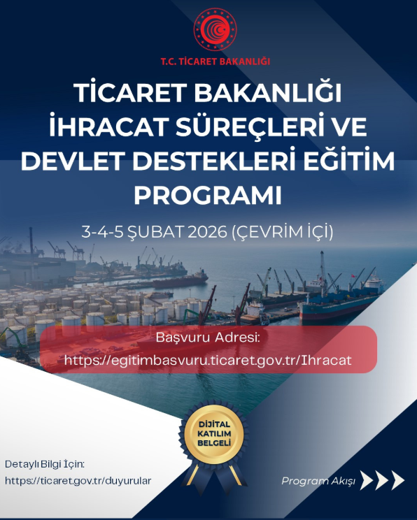 Ticaret Bakanlığı İhracat Genel Müdürlüğü tarafından, Türkiye’deki tüm iş çevrelerinin genel katılımına açık olacak şekilde 3-4-5 Şubat 2026 tarihlerinde çevrim içi bir eğitim programı düzenlenecektir. Program Ek-1’de yer alan akış çerçevesinde gerçekleştirilecek olup katılım ücretsiztir. Eğitimin en az üçte ikisine katılım sağlayan katılımcılar adına dijital Katılım Belgesi düzenlenecektir. Programa katılmak isteyenlerin, 2 Şubat 2026 tarihine kadar kayıt bağlantısı üzerinden başvuru yapmaları gerekmektedir. Başvuru sırasında bilgilerin eksiksiz ve doğru doldurulması ile başvuru ve toplantıya girişte aynı e-posta adresinin kullanılması önem arz etmektedir. Çevrim içi katılım bağlantısı 2 Şubat 2026 tarihinde başvuru yapan katılımcıların e-posta adreslerine iletilecektir.