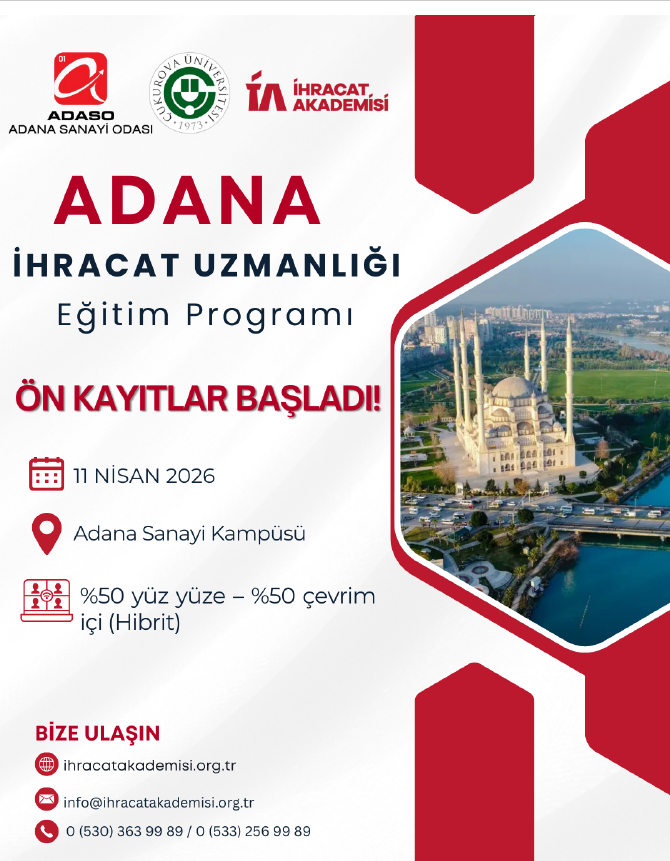 11 Nisan–18 Mayıs 2026 tarihleri arasında Adana Sanayi Kampüsünde gerçekleştirilecek Adana İhracat Uzmanlığı Eğitim Programı için ön kayıt süreci başlatılacaktır. Yeterli talep oluşması halinde kesin kayıtlar İhracat Akademisi’nin resmi internet sitesi üzerinden alınacaktır.