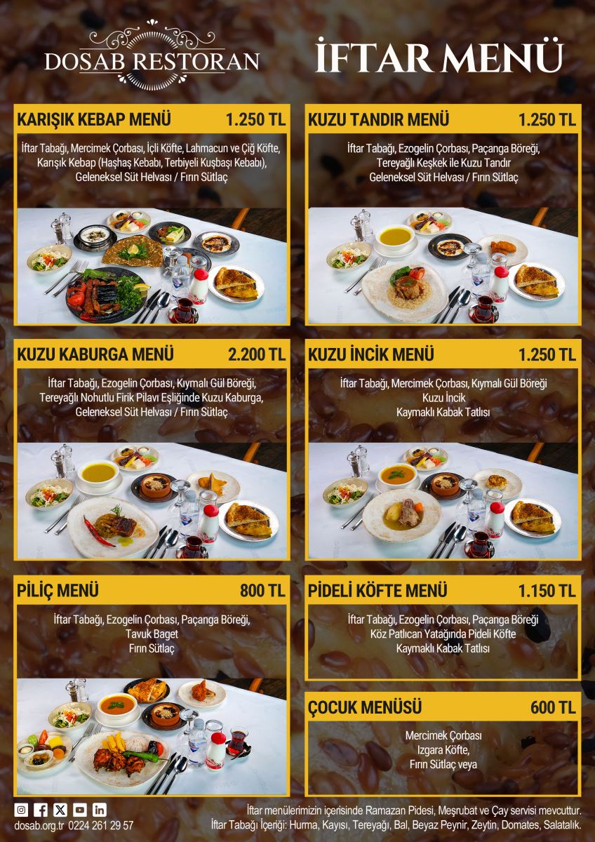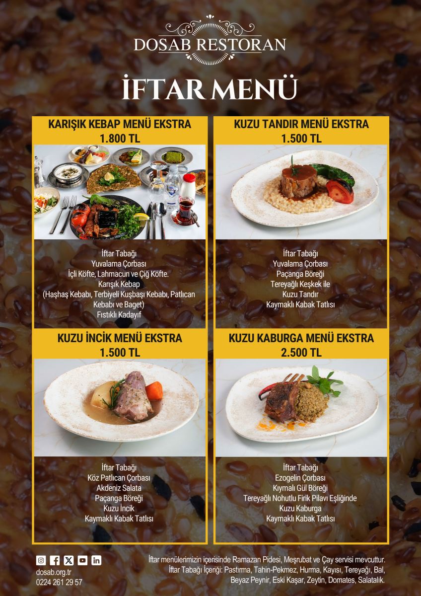 DOSAB Restoran, Ramazan Ayı boyunca zengin iftar menüleri ile hizmetinizde... Menü içeriklerini aşağıda inceleyebilirsiniz.