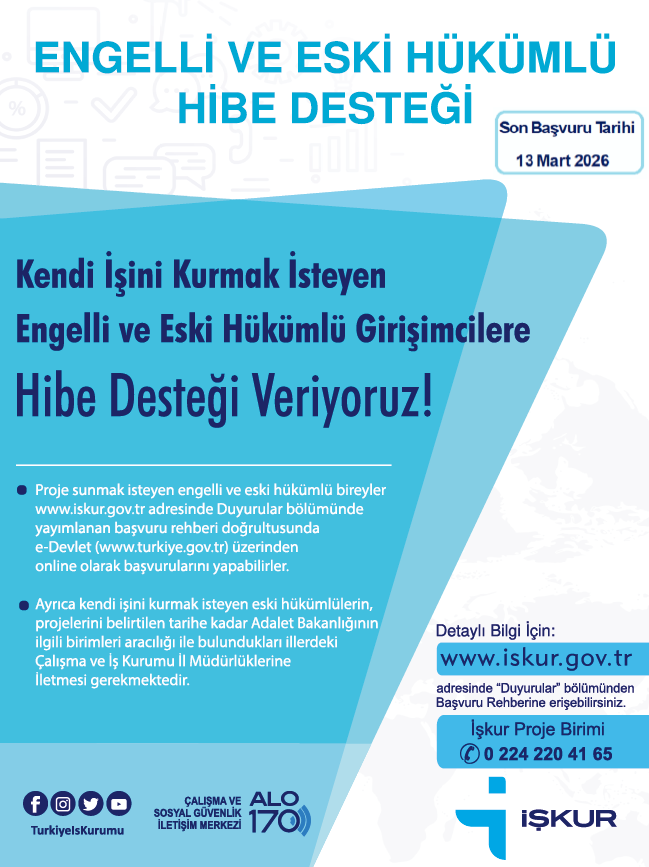 Engelli ve eski hükümlülerin istihdamını desteklemek amacıyla yürütülen hibe programı kapsamında yapılan yönetmelik değişikliği ile proje çağrıları yılda 6’ya çıkarılarak sürekli hale getirilmiştir. 2026/2. dönem başvuruları İŞKUR’un Engelsiz İŞKUR Hizmetleri sayfasında yayımlanmış olup, engelli ve eski hükümlülere yönelik hibe destek başvurularının son tarihi 13 Mart 2026’dır.