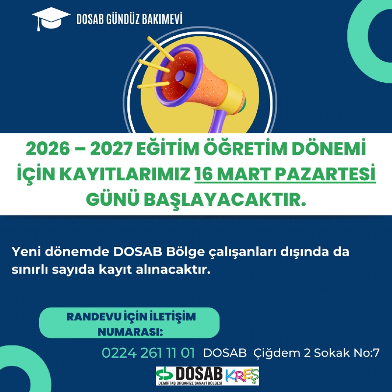 DOSAB Gündüz Bakımevi 2026–2027 Eğitim-Öğretim Dönemi kayıtlarımız 16 Mart Pazartesi günü başlayacaktır.