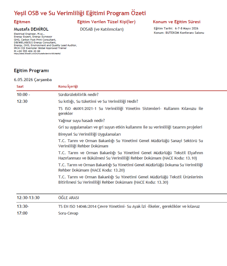 Yeşil OSB ve Su Verimliliği Eğitim Programımız 6-7-8 Mayıs 2026 tarihlerinde BUTEKOM Konferans Salonunda gerçekleştirilecektir. Eğitim programına linkten ulaşabilirsiniz.