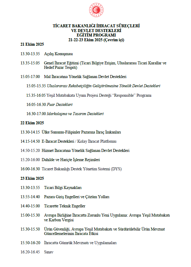Türkiye’deki tüm iş çevrelerinin genel katılımına açık olarak ekte yer alan program akışı çerçevesinde 21-22-23 Ekim 2025 tarihlerinde çevrim içi bir eğitim programı gerçekleştirilecektir.