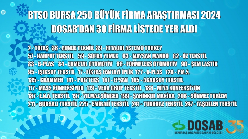 Bursa Ticaret ve Sanayi Odası’nın (BTSO) “Bursa İlk 250 Büyük Firma Araştırması - 2024” sonuçları belli oldu. Listede 30 DOSAB katılımcısı firma yer aldı.