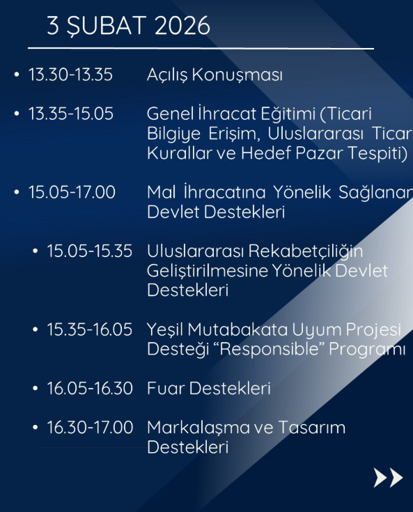 Ticaret Bakanlığı İhracat Genel Müdürlüğü tarafından, Türkiye’deki tüm iş çevrelerinin genel katılımına açık olacak şekilde 3-4-5 Şubat 2026 tarihlerinde çevrim içi bir eğitim programı düzenlenecektir. Program Ek-1’de yer alan akış çerçevesinde gerçekleştirilecek olup katılım ücretsiztir. Eğitimin en az üçte ikisine katılım sağlayan katılımcılar adına dijital Katılım Belgesi düzenlenecektir. Programa katılmak isteyenlerin, 2 Şubat 2026 tarihine kadar kayıt bağlantısı üzerinden başvuru yapmaları gerekmektedir. Başvuru sırasında bilgilerin eksiksiz ve doğru doldurulması ile başvuru ve toplantıya girişte aynı e-posta adresinin kullanılması önem arz etmektedir. Çevrim içi katılım bağlantısı 2 Şubat 2026 tarihinde başvuru yapan katılımcıların e-posta adreslerine iletilecektir.