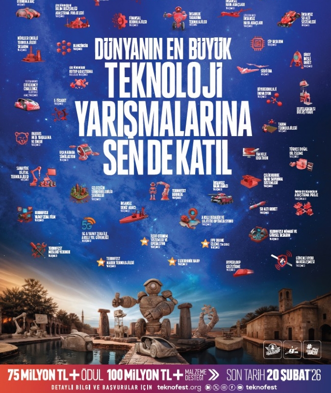Dünyanın en büyük havacılık, uzay ve teknoloji festivali TEKNOFEST kapsamında düzenlenen 2026 yılı teknoloji yarışmalarına başvurular başladı. Bu yıl yeni adresi Şanlıurfa olan TEKNOFEST, 75 milyon TL ödül ve 100 milyon TL’den fazla maddi desteğiyle genç zihinleri yeni keşiflere davet ediyor. Fikirleri projeye, projeleri geleceğe dönüştürmek isteyenler için yarışma başvuruları ise 20 Şubat’a kadar devam ediyor!